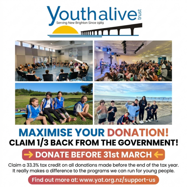 Just 5 more days until the end of the financial year. If you or your business were meaning to make a donation to charity in this financial year, would you consider donating to YAT?! Any donation before March 31st, allows you to claim 1/3rd back from the government. Give $100 and you’ll get $33 back. Give $500 and you’ll get $166 back. Give $1,000 and you’ll get $333 back! We have a budget shortfall this year, and rely on donations and grants to continue serving young people on the east of Christchurch. Your donation supports young people to attend clubs, training for volunteers, music opportunities, community events, youth workers in schools, parenting seminars and more. Find out more, including our regular donors scheme, Friends of YAT, and our bank details at: www.yat.org.nz/support-us