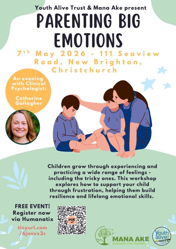 FREE Parenting Seminar in New Brighton on Thursday 7th May for anyone dealing with children with Big Emotions! Children grow through experiencing and practicing a wide range of feelings – including the tricky ones. This workshop, led by Catherine Gallagher – Clinical Psychologist for over 20 years, explores how to support your child through frustration, helping them build resilience and lifelong emotional skills. Ran in partnership with Youth Alive Trust and Mana Ake – Stronger for Tomorrow. Get your free ticket now: https://events.humanitix.com/parenting-big-emotions-free-seminar and follow the facebook event for any updates: www.facebook.com/events/2036495380259989