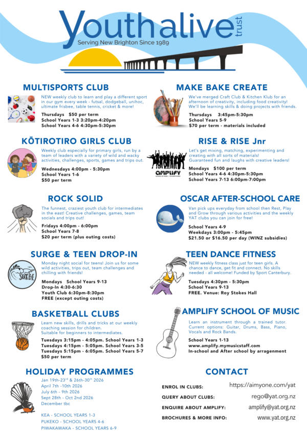 Term 2 Club Bookings are LIVE. Oscar after-school care, Multi-Sport Clubs. Basketball Clubs. Make-Bake-Create. Rock Solid Intermediates Club. Surge Teens Club & Drop-In. Kōtirotiro Girls Club, RISE, RISE Jnr and DanceFit. Check out each clubs page on our website for full term plans then sign up on our new booking system: https://aimyone.com/yat